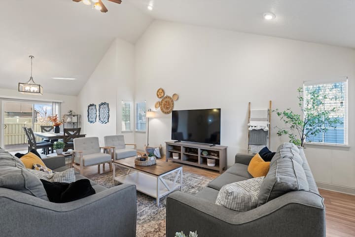 Acogedora casa con fogata y TV de 70 pulgadas