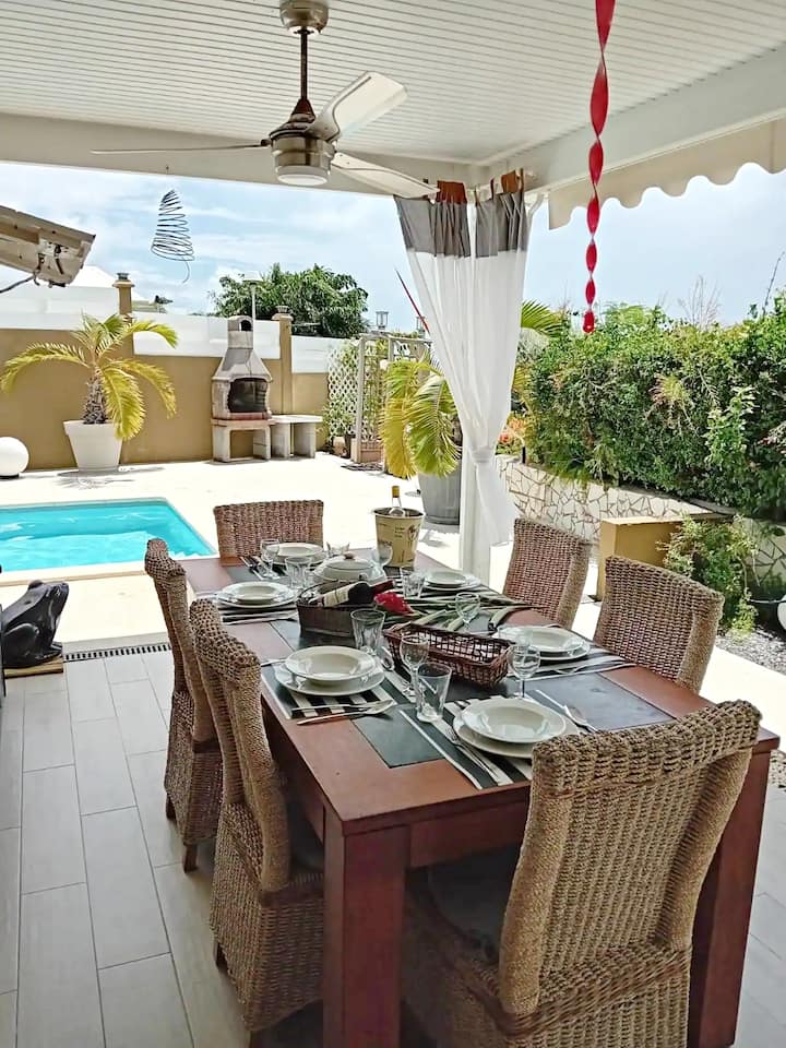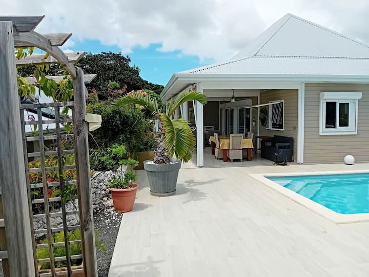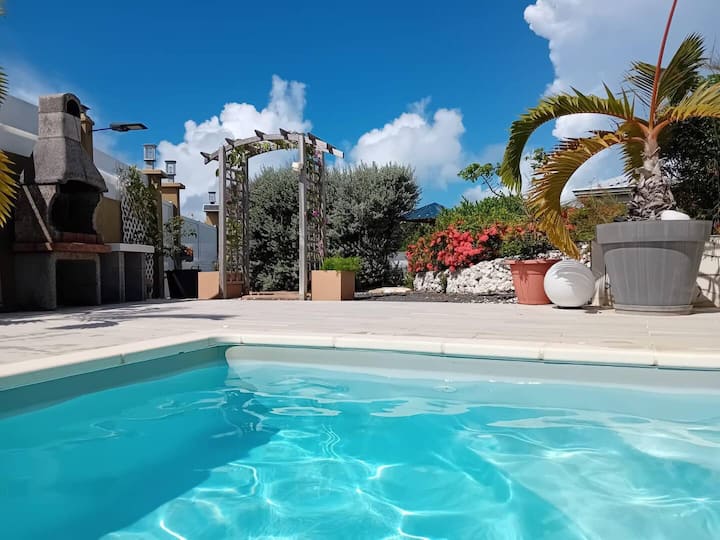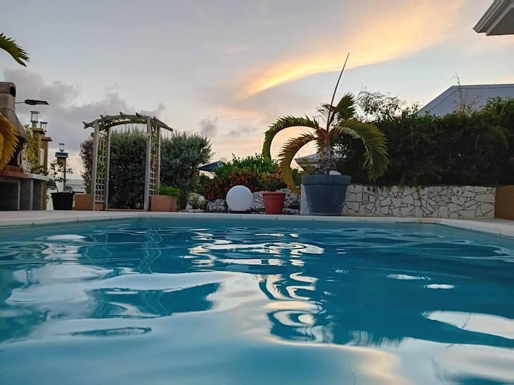 La acogedora villa es un alojamiento muy bonito totalmente equipado para unas vacaciones en familia, en pareja o con amigos. Con capacidad para ocho residentes (idealmente 6 adultos y 2 adolescentes), tres habitaciones grandes con aire acondicionado y dos baños, este alquiler casa con piscina en Saint-François le promete el máximo confort.