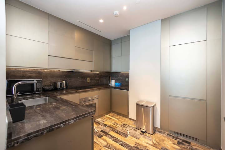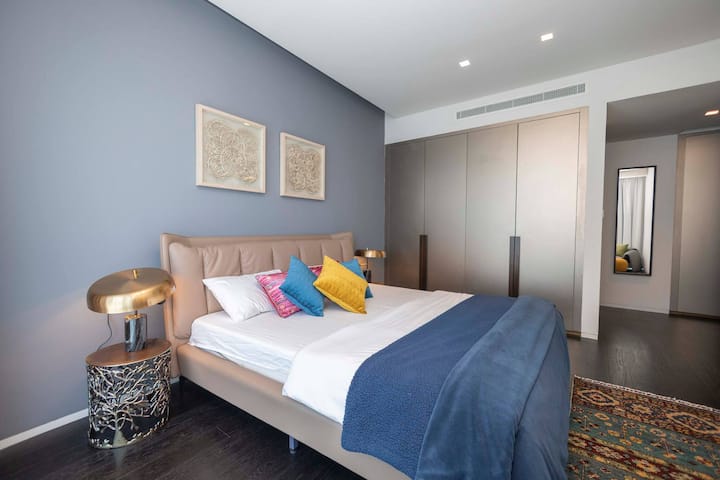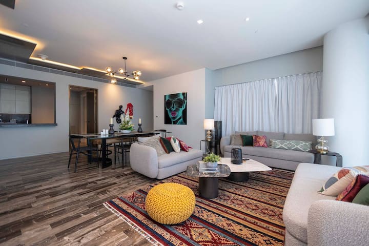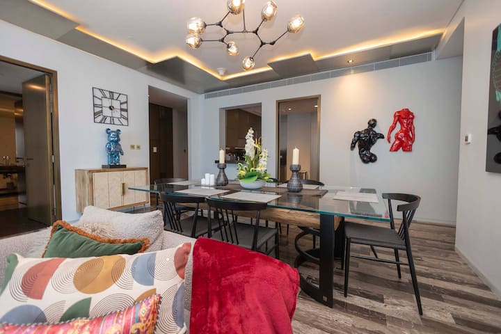 Este espacioso apartamento de 3 dormitorios diseñado por Fendi viene con un enorme balcón y está equipado con muebles de primera línea, utensilios de cocina de excelente calidad y un estacionamiento exclusivo. El dormitorio principal tiene una cama tamaño king con la ropa de cama más suave, una caja de seguridad, una plancha eléctrica y un baño privado con ducha y bañera. El segundo dormitorio tiene una cama tamaño queen y baño privado. La tercera habitación contiene una cama tamaño queen con colchón de la mejor calidad, sábanas, vestidor y espejo y baño compartido justo enfrente de la habitación. La cocina totalmente equipada incluye todos los electrodomésticos y una cafetera. El comedor tiene capacidad para 6 personas. Además, hay una pequeña habitación que se puede utilizar para el almacenamiento o como habitación de servicio con un baño y un tocador adicional. El espacio habitable está diseñado estéticamente y es un placer absoluto vivir en él. Te proporcionamos todos los servicios, como toallas limpias, ropa de cama limpia, pañuelos de papel, líquido para lavavajillas, cápsulas de lavadora, agua, cápsulas Nespresso, té, champú, acondicionador, gel de ducha, crema corporal y kit dental.