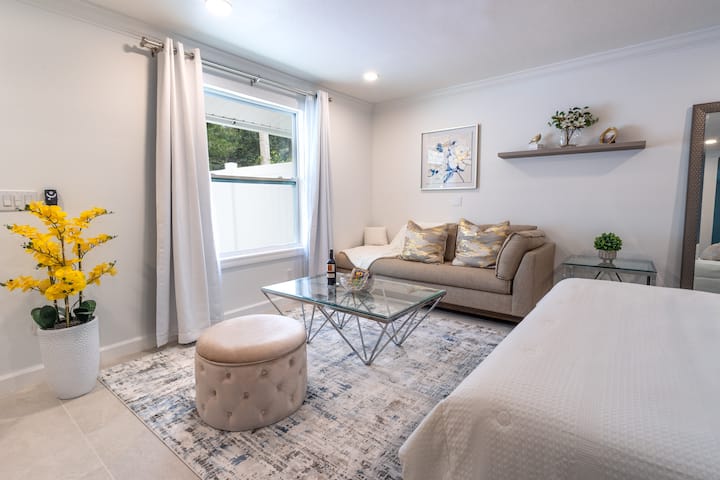 Estudio de nueva construcción con cama tamaño king y bañera de inmersión