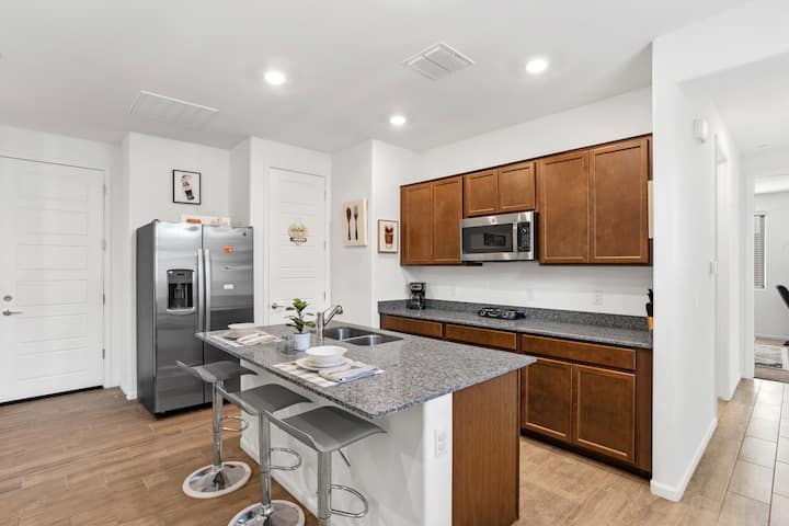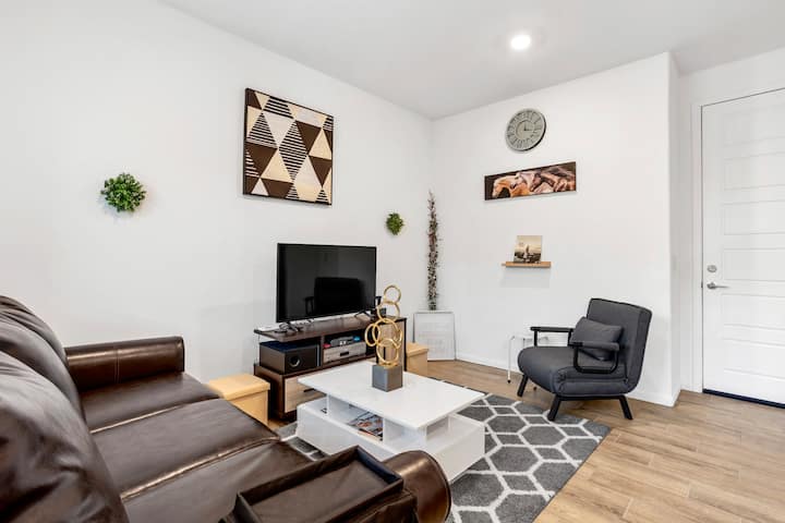 Este espacioso apartamento de un dormitorio bellamente amueblado cuenta con un plano de piso abierto con una cocina totalmente equipada, asientos en la encimera y una acogedora sala de estar con un televisor inteligente de 48 pulgadas. La cocina incluye nevera, lavavajillas, olla instantánea, arrocera, freidora/microondas, parrilla George Foreman, licuadora y tostadora.