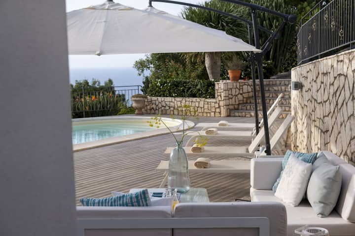 La villa cuenta con una piscina de forma única, de aproximadamente 8 x 4 metros, con una profundidad de 1,3 metros. El área de la piscina incluye un solárium equipado con tumbonas y sombrillas, perfecto para tomar el sol y disfrutar de las impresionantes vistas.