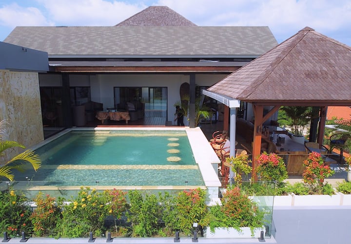 Los huéspedes tienen acceso privado completo a los tres niveles de la villa, incluida la terraza de la azotea, todas las piscinas, cocinas y zonas de estar. Toda la propiedad es exclusivamente tuya