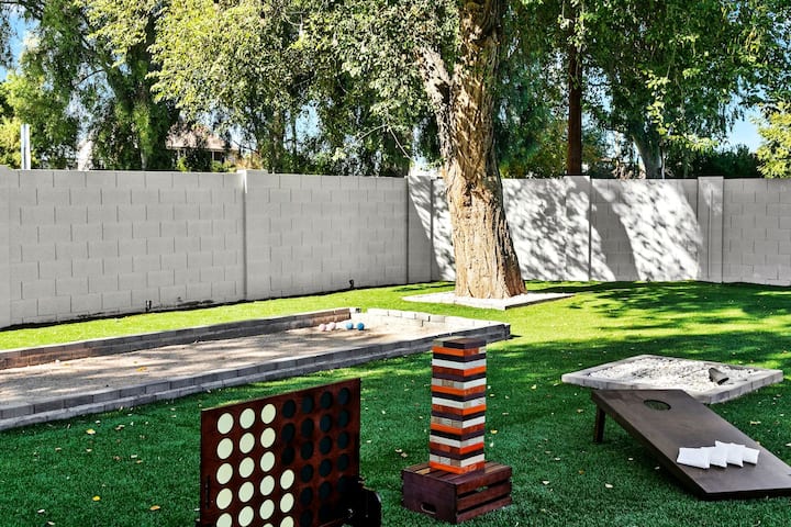 ¡Disfruta del amplio área de recreación compartida en el patio delantero de esta propiedad! Equipada con minigolf, Corn Hole, Life-Size Jenga y Connect Four, y un montón de espacio abierto para correr y jugar, ¡esta zona tiene algo para todos! Ten en cuenta que esta zona del patio delantero se comparte entre todas las unidades de la propiedad, por lo que es posible que compartas estos servicios con otros huéspedes. Sin embargo, los espacios del patio trasero son privados para cada unidad individual para aquellos momentos que elijas ser menos sociables.