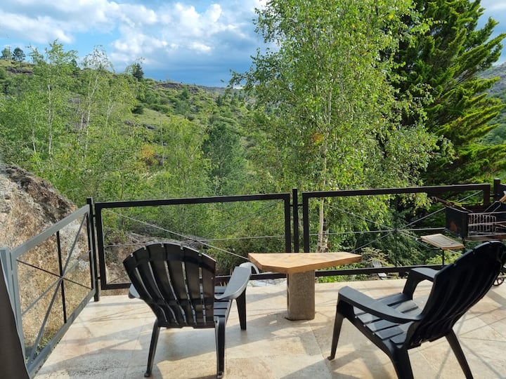 cabaña frente a las sierras