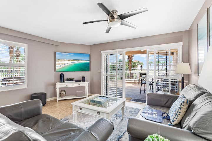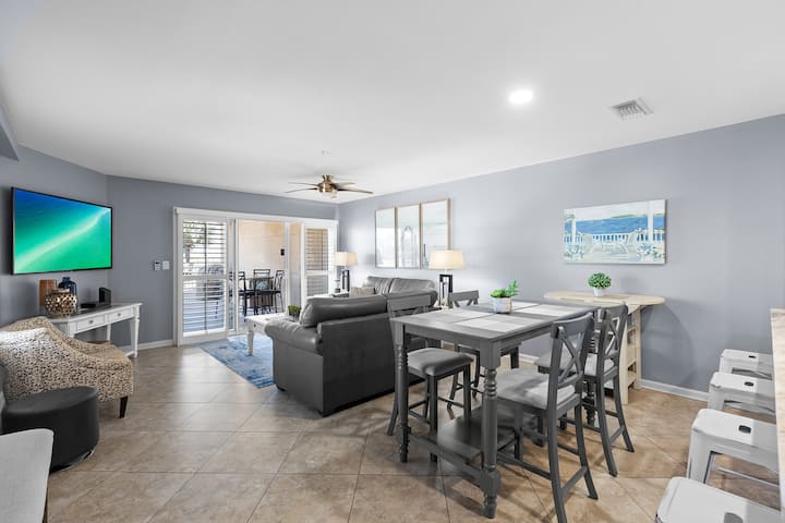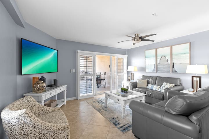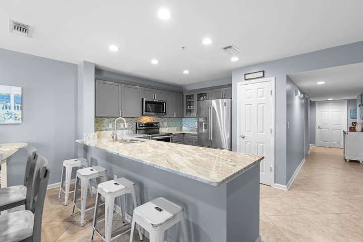 Este elegante condominio en la planta baja de Miramar Beach combina elegancia con comodidad y conveniencia, ofreciendo tres dormitorios y tres baños completos para alojar hasta seis huéspedes. Entra en un espacio habitable luminoso y abierto lleno de luz natural y estilo costero. Los sofás de cuero grisáceo, un gran televisor de pantalla plana y muebles encalados hacen que el área de estar sea relajante y refinada. La cocina gourmet contigua cuenta con encimeras de granito, electrodomésticos de acero inoxidable, una pared trasera de azulejos de vidrio y una espaciosa barra de desayuno con cuatro taburetes. Una mesa de comedor separada tiene capacidad para cuatro comidas informales o noches de juegos por la noche.