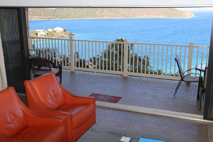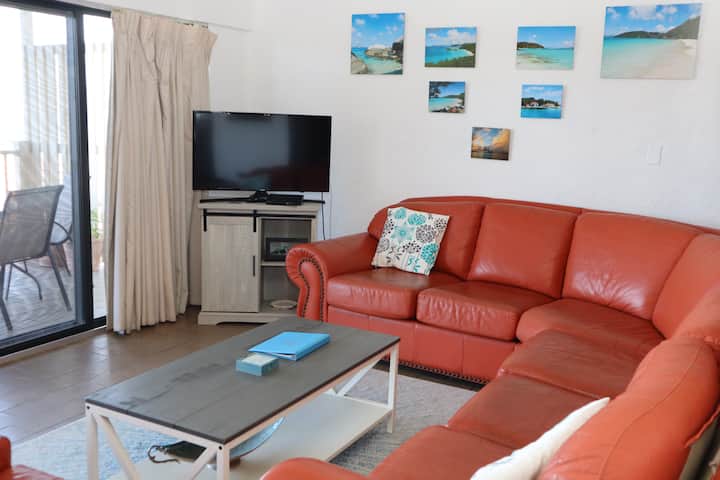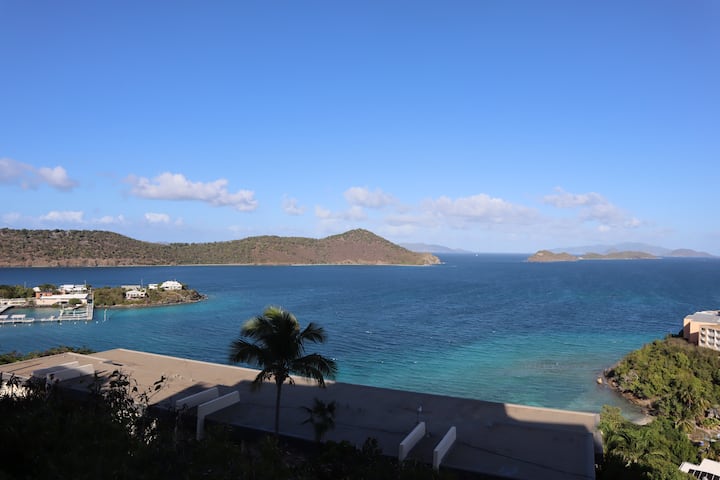 Esta villa en la cima de una colina con wifi gratuito de 100 MB ofrece una cocina recién renovada y increíbles brisas y vistas a la isla. El dormitorio tamaño king tiene un baño con una gran ducha justo al otro lado del pasillo cuando entras en la villa. Unos escalones más abajo te llevan a las grandes áreas de estar con cocina recientemente renovada, comedor y sala de estar, todas con increíbles vistas al agua y a la isla. La cocina totalmente equipada tiene todo lo que necesitas durante tu estancia, incluyendo cafetera, licuadora, utensilios de cocina, tostadora, microondas y más. La mesa de comedor interior para cuatro personas se abre a la sala de estar con grandes puertas correderas de vidrio que conducen al balcón. Disfruta cenando en el balcón mientras disfrutas de la brisa y las vistas caribeñas. Esta villa se encuentra a pocos pasos de la piscina Hilltop. El vestíbulo y el centro de actividades del centro vacacional están a poca distancia a pie cuesta abajo o solicitamos el transporte gratuito ofrecido a nuestros huéspedes. El aparcamiento está en la zona de aparcamiento en la cima de una colina, cerca de la piscina en la cima de la colina.