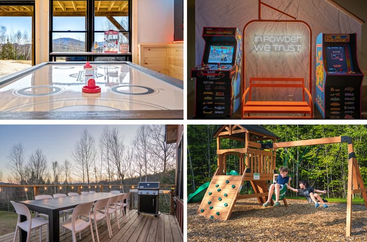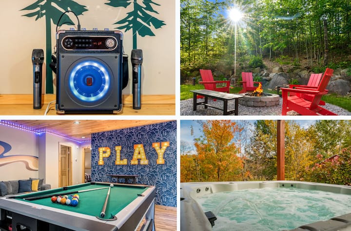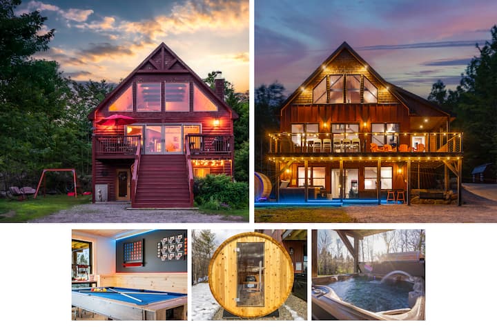 Escápate a Hideaway Havens en Bethel, dos impresionantes chalets a solo 2 minutos de distancia en una calle tranquila, cerca de esquí, restaurantes y diversión al aire libre. Capacidad para 29 personas. Disfruta de impresionantes vistas a la montaña, sumérgete en 2 bañeras de hidromasaje, relájate en una sauna de barril, asa malvaviscos en 2 fogatas y juega en salas de juegos con salas de juegos, mesa de billar, hockey de aire, ping pong y karaoke. Disfruta de chimeneas, camas tamaño king, cocinas de chef, parrillas para barbacoa, columpios para niños y mucho más. Apto para bebés, niños y mascotas. Crea recuerdos mágicos en la montaña.