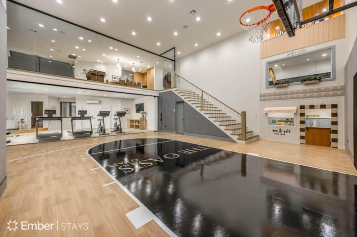 ¡Descubre el refugio perfecto para tu próxima reunión en The Oasis! Esta lujosa finca de 8 dormitorios y 11 baños está diseñada para la relajación, el entretenimiento y la diversión inolvidable. Sumérgete en la piscina climatizada y fría, que se completa con un tobogán, una cascada y despertadores al aire libre. Organiza noches de cine o sesiones de karaoke en tu teatro privado para 30 personas, que incluye un puesto de concesión. La cocina gourmet cuenta con electrodomésticos Wolf y Sub-Zero de primera línea, islas dobles y una despensa de mayordomo. Mantente al día con tu rutina de fitness en la sala de ejercicios, con pesas libres, una cinta de correr, una bicicleta, una inmersión en el frío y una sauna. A los niños les encantará la casa de juegos de tres niveles, mientras que toda la familia puede disfrutar de juegos de arcade y una mesa de billar en la sala de juegos. La propiedad también cuenta con una cancha de baloncesto que se puede transformar en una sala de baile. Con estacionamiento para un máximo de 8 vehículos, incluido un garaje para 4 autos con un cargador Tesla, The Oasis ofrece un amplio espacio para todos tus huéspedes.
