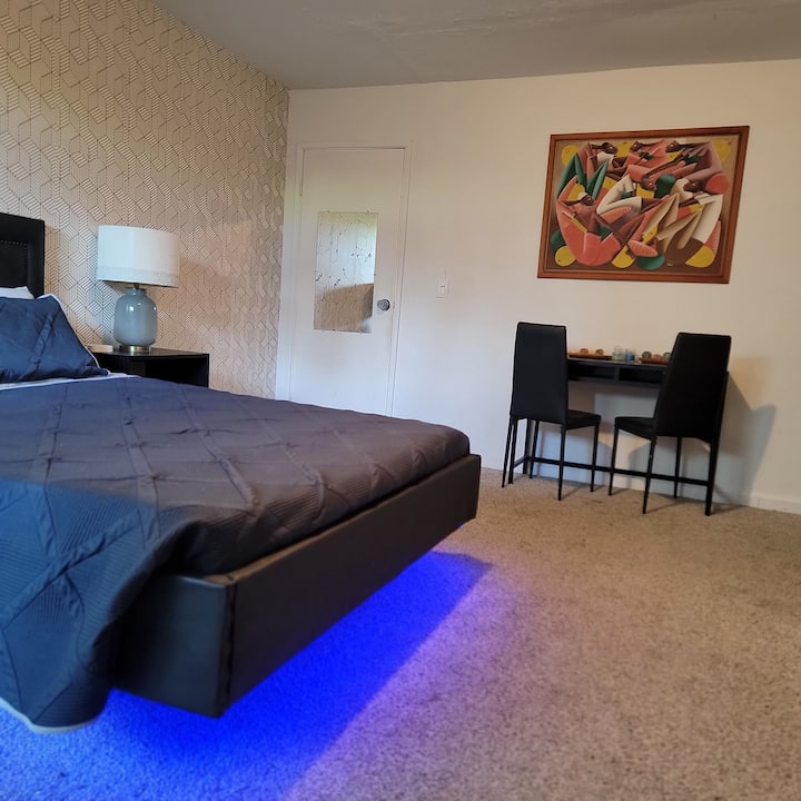 Cama flotante, alfombra y balcón