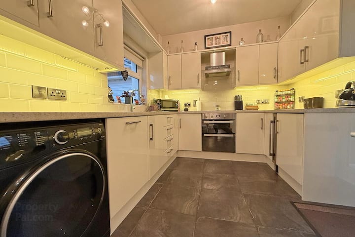 Esta encantadora casa ofrece una cocina/comedor de planta abierta que conduce a una sala de estar trasera con una estufa multicombustible y un televisor de pantalla grande (55 pulgadas). Un gran sofá de esquina envuelve la habitación.