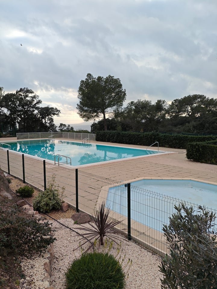 Estudio y terraza/vista al mar ds Residencia con piscina