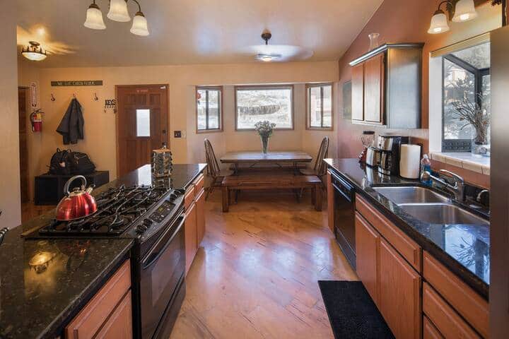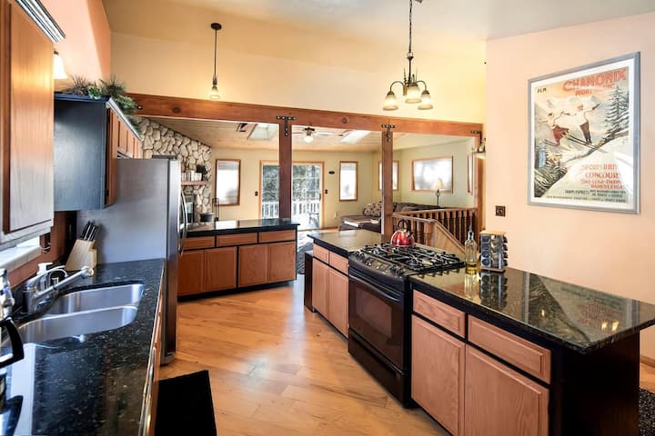 A diferencia de la mayoría de las cabañas en Big Bear, tenemos calefacción central con respiraderos en todas las habitaciones y agua caliente ideal para una ducha satisfactoria. La sala de estar y la cocina son de concepto abierto con mucho espacio en el mostrador para cocinar y hornear el contenido de tu corazón. El chalet es rústico con un toque de lujo a la vez. Créeme, te va a encantar este lugar. (¡Sin duda lo hacemos!)