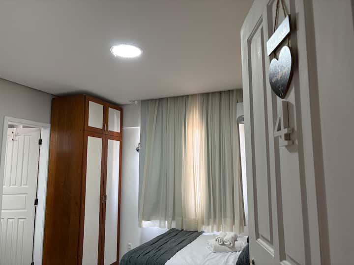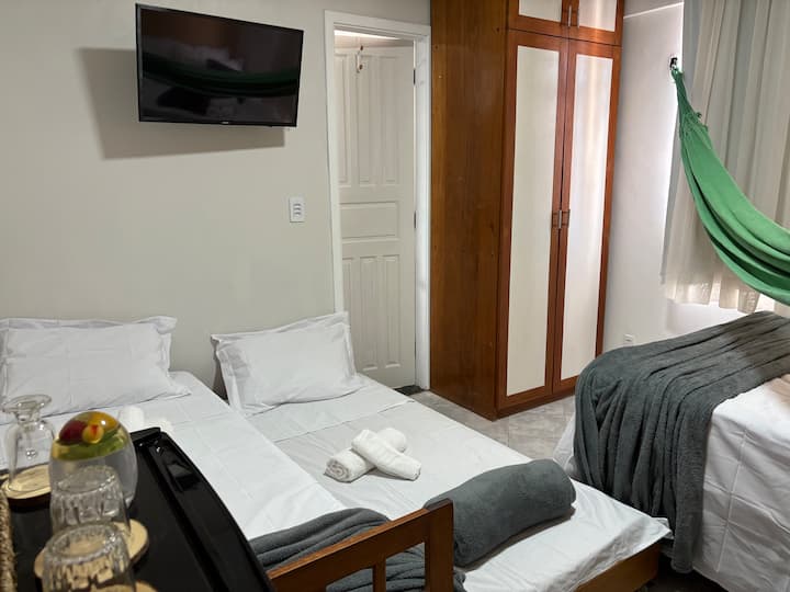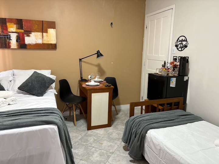 El apartamento tiene una ubicación excepcional y estratégica, perfecta para participar en la COP30 (10 km, 18 min en coche) sin dejar de conocer la ciudad y realizar actividades de OCIO, COMPRAS, EXPERIENCIAS GASTRONÓMICAS y NEGOCIOS. También es ideal para participar en la PROCESIÓN DE LA VELA sin perder tiempo con el transporte. Es fácil hacer casi todo a pie. Será una experiencia única, útil y agradable. El AP, además de la suite, también tiene 1 suite/estudio más y 2 dormitorios, cocina y área de servicio. Se encuentra en el centro histórico de Belém, a una cuadra de Shopping Pátio Belém, en una calle residencial y tranquila. Al cruzar la calle del edificio tienes acceso inmediato a uno de los mejores centros comerciales de Belém, que funciona de 07:00 a 22:00, ofreciendo varios servicios allí, cubriendo una amplia gama de necesidades (restaurante por kilo y bar de sushi con música en vivo a la hora del almuerzo, de lunes a domingo; panadería, cafetería que ofrece desayuno/sopas/mingaus; bodega; farmacia; tienda de productos naturales y suplementos; tienda departamental; mascotas; comida rápida; clínica médica popular; casa de lotería y lavandería). El sector administrativo y comercial de la capital también se encuentra en las inmediaciones del edificio, mientras que el aeropuerto se encuentra a solo 25 minutos. La suite, con capacidad para un máximo de 4 personas, cuenta con un exclusivo e individual CAFÉ CORNER y está equipada con 1 cama doble de resortes, 1 cama doble, armario, mesa de estudio y/o comidas rápidas con lámpara y dos sillas, minibar, TV inteligente Samsung de 32", Wi-Fi, aire acondicionado Split y ventilador. El baño privado tiene ducha eléctrica. Se ofrecen sábanas y almohadas, toallas y una RED DE DESCANSO TÍPICA de la AMAZONÍA, para que el huésped pueda tener un momento de relajación en una pieza regional. Además de poder hacer uso de una cocina completa y finamente equipada (con freidora de aire, microondas, exprimidor de frutas, cafeteras de varios tipos, hervidores de varios tipos, sándwichera, rincón de café equipado con varios accesorios, entre otros), el huésped tendrá disponibles en la habitación algunas piezas de platos y accesorios para su uso privado (platos, cubiertos, vasos, tazas, cafeteras, galletas y leche en polvo, fabricante de azúcar y cafetera rústica con soporte). Hay secador de pelo y plancha en el espacio colectivo.
