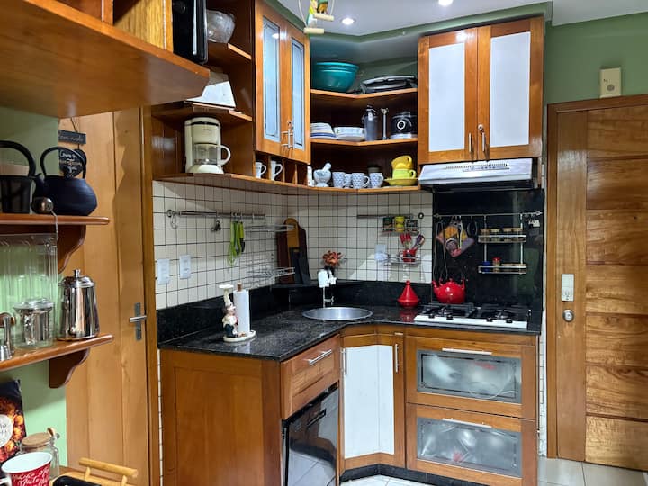 COCINA: Los huéspedes pueden hacer uso de una cocina compartida con los huéspedes de los 3 dormitorios del apartamento, totalmente y finamente equipada (con freidora de aire, microondas, exprimidor de frutas, cafeteras de varios tipos, hervidores de varios tipos, sandwichera, rincón de café equipado con varios accesorios, entre otros). Además, el huésped tendrá a su disposición en la habitación algunas piezas de vajilla y accesorios para su uso privado (platos, cubiertos, vasos, tazas, tazas, cafeteras, galletas y leche en polvo, azúcar y cafetera rústica con soporte).