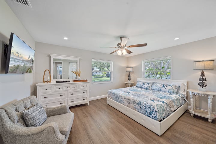 Alójate, nada y disfruta del sol de Sarasota en esta villa de inspiración costera con piscina privada de agua salada climatizada. A solo 4 minutos de Siesta Key, esta casa de un solo nivel ofrece comodidad costera, privacidad y espacio para un máximo de 10 huéspedes. Ubicado en un tranquilo barrio frente a la bahía, a poca distancia a pie de cafés, restaurantes, parques y miradores al atardecer, es un raro alquiler vacacional en Sarasota que se siente conectado y aislado.