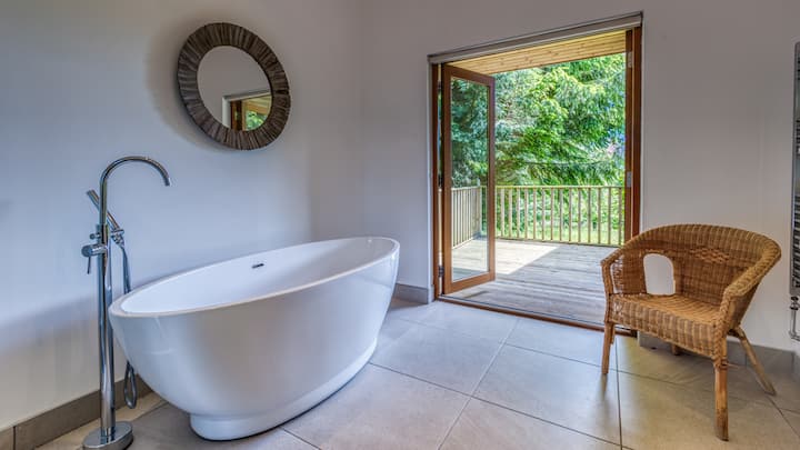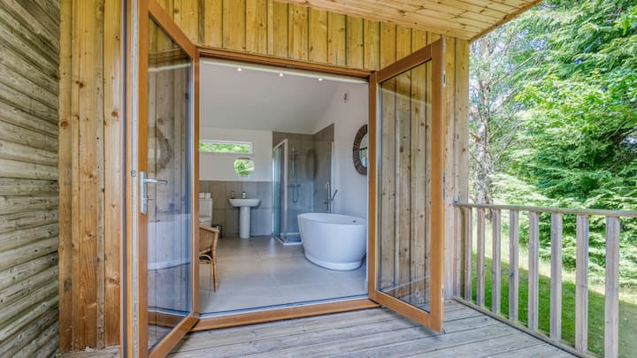 La cabaña cuenta con dos amplios dormitorios con baño diseñados para la comodidad y la serenidad. El dormitorio principal cuenta con una cama tamaño king con lino blanco fresco, TV de pantalla plana y el toque reconfortante de mantas y cojines de White Company. La habitación doble ofrece dos camas individuales con colchones de espuma viscoelástica para un sueño reparador. Ambos baños están equipados con exuberantes toallas de baño, batas personales y más, y el baño principal ofrece una lujosa bañera independiente, ducha a ras de suelo y acceso al patio para una mayor relajación.