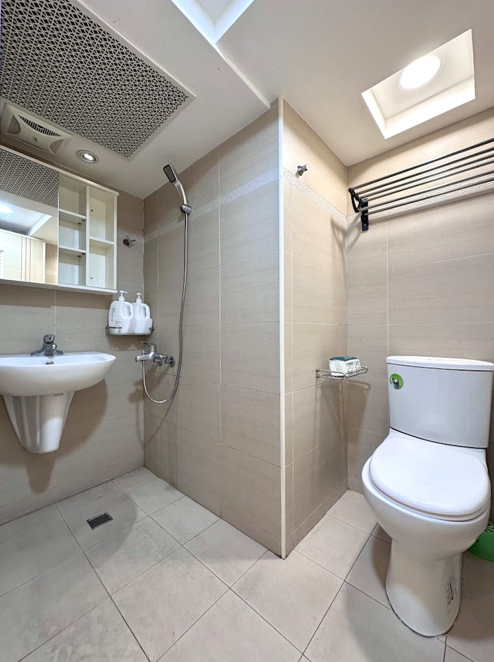 Todos nuestros espacios de baño privado están diseñados con un espacio hermoso, espacioso y cómodo, para que puedas disfrutar y lavarte después de un día completo de viaje.Con el fin de aumentar la confusión antideslizante del suelo, el piso del baño está especialmente seleccionado para azulejos de color claro de área pequeña para proporcionar un entorno seguro a los ancianos y niños pequeños.Además, te proporcionaremos artículos de tocador sencillos (jabón corporal, champú, etc.), pero trae tus propios productos de limpieza personales, como pasta de dientes con cepillo de dientes.