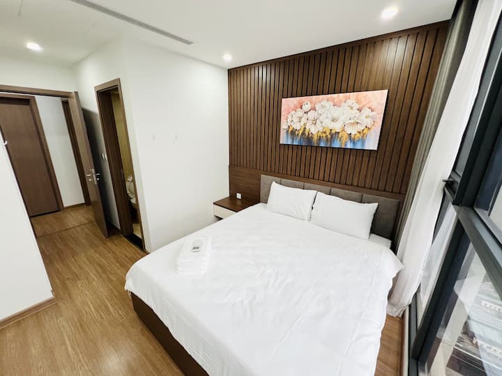 Dos dormitorios separados, equipados con camas suaves, ropa de cama limpia y fragante, gabinetes cómodos y grandes ventanales con vista al lago o a la ciudad, creando un espacio de descanso ideal después de un largo día. El baño está limpio, lleno de toallas, secadora, artículos de tocador de alta gama, proporcionando una sensación cómoda como un hotel de 5 estrellas.