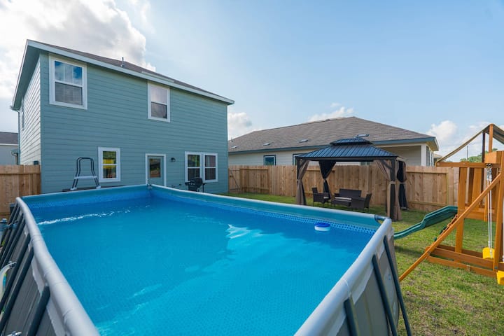 Esta encantadora casa de 3 habitaciones cuenta con una cama queen, dos literas, una cama king, una cuna y una cama inflable. Esta pintoresca propiedad es perfecta para familias. Disfrute de la piscina elevada, el jacuzzi, el aire acondicionado, el wifi y mucho más durante su estancia. Reserve ahora y disfrute de todo lo que esta casa le ofrece.