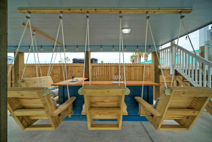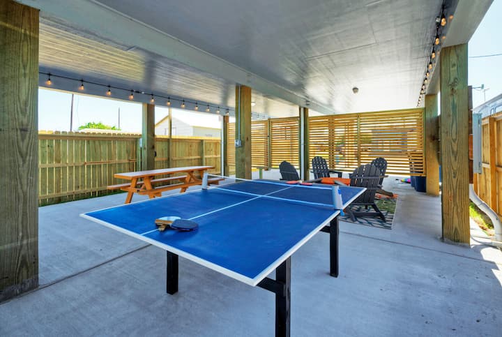 Sal y encontrarás una zona de reunión cubierta con un bar y asientos columpios, una mesa de ping pong, una parrilla y un comedor al aire libre a la sombra, perfecto para relajarse después de un día de explorar la ciudad o descansar en la playa. Justo más allá de la puerta, tu piscina privada te espera, ofreciendo un refrescante chapuzón en los días soleados. Arriba, puedes ver tanto el amanecer como el atardecer desde las cubiertas delantera y trasera, cada una equipada con asientos para disfrutar de las vistas.