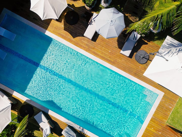 Bali House tiene capacidad para 14 personas en dos espacios de estar distintos: una casa principal con dos pisos y una casita separada con gimnasio, dormitorio y dos baños. La propiedad tiene una piscina de tamaño completo, cocina al aire libre y es muy privada.