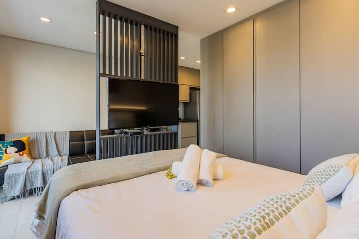 Nuestro estudio fue diseñado con un diseño y decoración modernos y sofisticados, creando un ambiente acogedor y funcional para tu estancia: