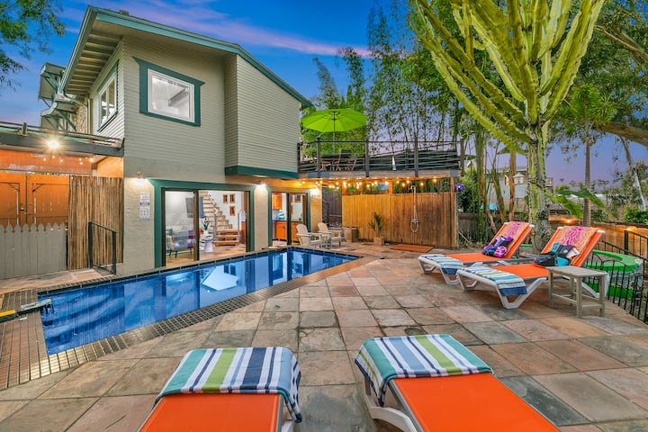 Piscina climatizada, chimenea, patio trasero tropical, zoológico de San Diego, SD1