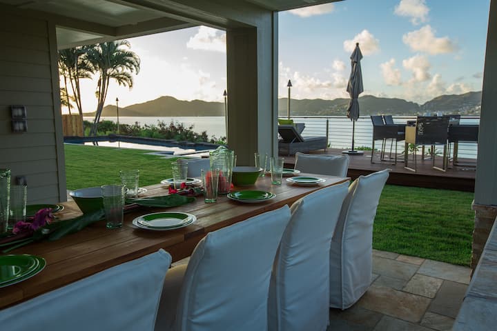 Esta villa es una impresionante casa de lujo contemporánea completa con una PISCINA, jacuzzi y salón con fogata en un entorno muy privado (no hay otras unidades/casas en la propiedad con solo un vecino adyacente, ¡las comodidades son todas tuyas!). La casa de cinco dormitorios y cuatro baños se amplió y remodeló por completo a mediados de 2013 en una perfección de lujo de cinco estrellas. Con muebles de alta gama que incluyen electrodomésticos Subzero, Miele, Grohe y Bosch (quemador de gas) en la cocina, junto con detalles de acero inoxidable y azulejos/piedra personalizados por dentro y por fuera, no se escatimó en gastos. Todos los muebles fueron diseñados a mano y coordinados en todas partes. Toda la casa y los alrededores fueron diseñados para capitalizar la paz, la belleza y el “zen” natural de la propiedad. Desde el momento en que pasas por la entrada cerrada segura, te recibe un camino de entrada personalizado y un exuberante paisaje que te lleva de vuelta a las espectaculares vistas de la isla.