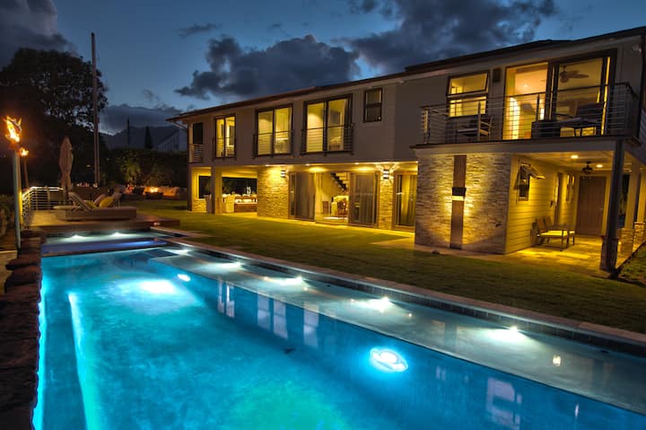 Pasa tiempo con tu familia y amigos en la piscina climatizada, en el spa con chorros para doce personas o en la cubierta IPE personalizada mientras disfrutas de las pintorescas vistas de los cielos abiertos, el océano y las montañas. Cena al aire libre o bajo las áreas cubiertas del lanai rodeadas de antorchas Tiki de propano que crean un ambiente cálido e íntimo. Toma una copa de vino y disfruta de hermosas conversaciones bajo la noche iluminada por la luna junto al fogón de cobre (gas) con asientos de salón para 12 personas. Mientras estés dentro de la casa, disfruta de una comodidad completa con aire acondicionado central, 7 televisores de alta definición (incluido un televisor al aire libre para todo tipo de clima), WIFI de alta velocidad, intercomunicador/cámaras de seguridad de la puerta/propiedad y un hermoso bar húmedo. ¡Cada habitación de la casa tiene hermosas vistas al mar y a la montaña y tres de las habitaciones tienen lanais privados!