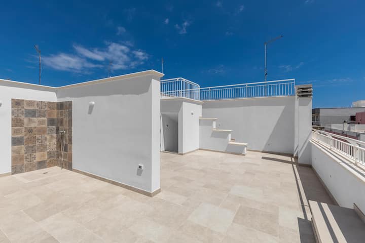 Una escalera interna conduce a la terraza, donde también hay una sala de relajación con sofá y un baño de servicio con lavabo e inodoro. Desde la terraza con solárium y ducha al aire libre se puede disfrutar de vistas panorámicas de la ciudad.