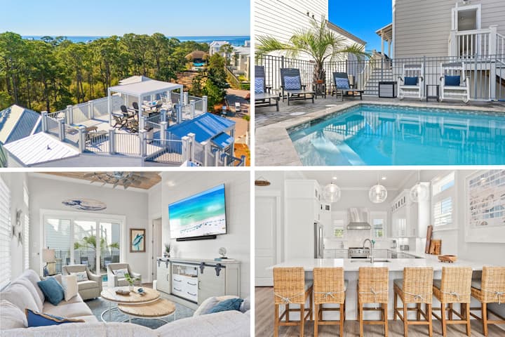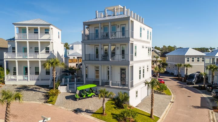 ACERCA DEL ALOJAMIENTO: conoce a Villa Anesi, tu escapada junto a la playa de varios niveles construida para el sol, el estilo y las escapadas en grupo inolvidables. Con cinco dormitorios, vistas panorámicas al golfo y servicios de lujo en todas partes, este vibrante refugio fue diseñado para impresionar a todos los niveles, literalmente. El corazón de la casa está en el segundo piso, donde los interiores costeros y elegantes y una sala de estar principal de concepto abierto invitan a relajarse. La cocina del chef es de ensueño, equipada con electrodomésticos de acero inoxidable, una máquina de hielo independiente y una cafetera Cuisinart Duo. ¿Te apetece una pequeña dicha junto a la piscina? Sal a la piscina privada y al patio con tumbonas, parrilla y altavoces Sonos para sacar el sonido de tu baño. En el tercer piso, encontrarás tres dormitorios tamaño king, cada uno con baños en suite con tocadores dobles y elegantes duchas a ras de suelo. Dos de estas habitaciones ofrecen acceso al balcón, por lo que es fácil recibir la mañana con una brisa salada. El cuarto piso tiene que ver con la diversión y la flexibilidad. Cuenta con una segunda sala de estar, una acogedora cocina pequeña (con nevera para bebidas, fregadero y Keurig), una mesa de juegos, un juego de juegos y dos literas, una con una cama tamaño queen sobre king y la otra con literas individuales/individuales y completas/completas, además de acceso al balcón. ¿En la parte superior? Tu joya privada de la corona: una terraza en la azotea con una sala de estar cubierta, mesa de fogata de propano, cornhole y impresionantes vistas panorámicas al mar, el mejor lugar para cócteles al atardecer y colgar estrellas. Con un carrito de golf disponible, moverse por Inlet Beach y 30A es muy fácil. Ya sea que estés aquí para relajarte, explorar o entretener, Villa Anesi ofrece el espacio y el entorno para hacerlo todo con estilo.
