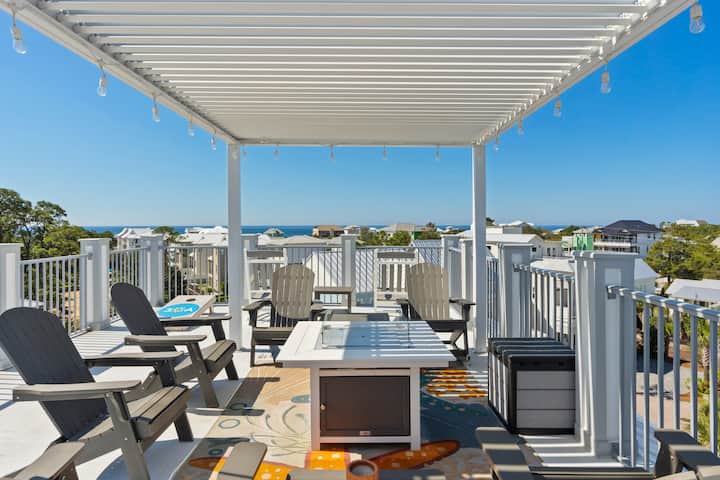• Terraza en la azotea con vistas al mar, chimenea, asientos en el salón y cornhole