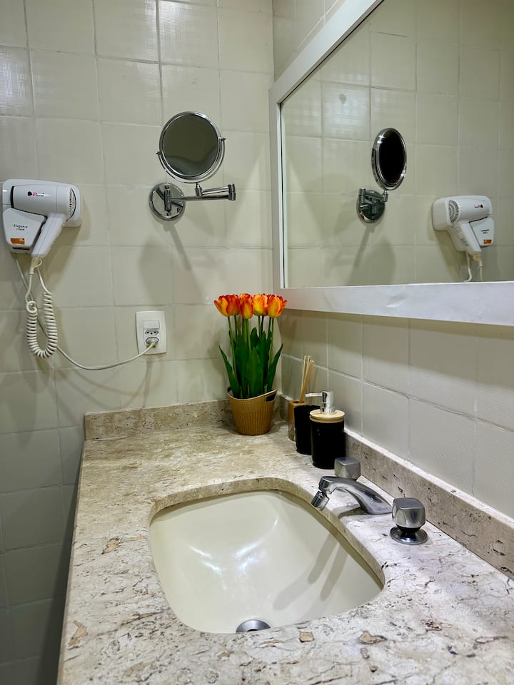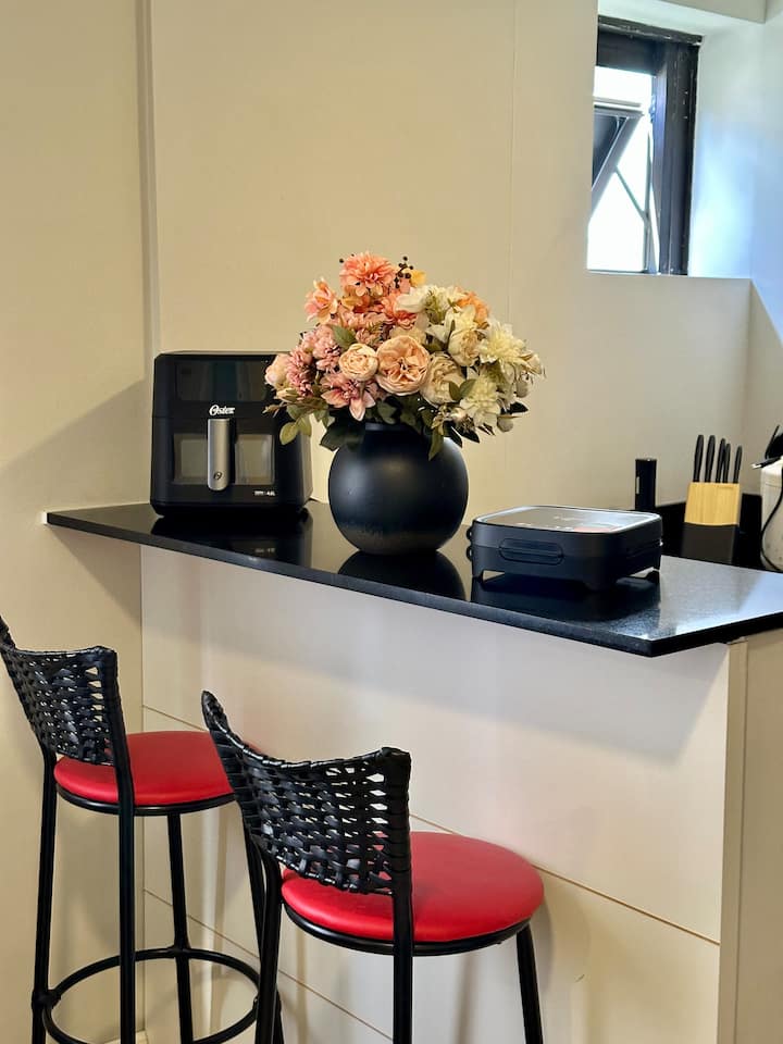 El **televisor giratorio** te permite ver tus programas favoritos desde diferentes ángulos, ya sea desde la cama o el sofá. La **cocina** está equipada con los electrodomésticos esenciales: refrigerador, horno, microondas y *freidora de aire*, perfecta para estadías más largas o viajes de negocios. El baño, aunque sencillo, es funcional y sirve bien para el uso diario.