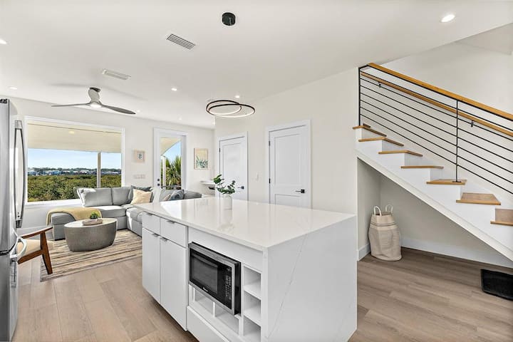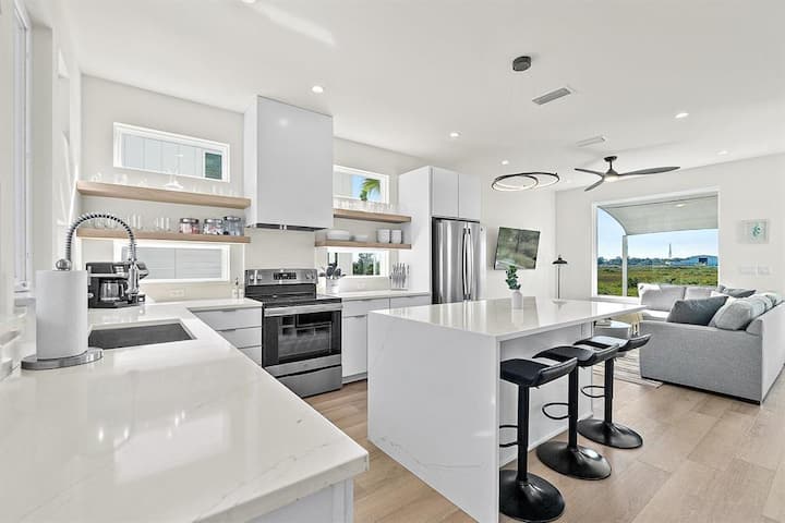 Relájate en el salón con vistas a los pantanos en el sofá de cuero suave y dos cómodos sillones mientras te pones al día con todos tus programas favoritos en el televisor inteligente montado en la pared con televisión Hulu Live incluido. La casa está perfectamente preparada para trabajadores remotos o estudiantes con un espacio de trabajo personalizado junto a la ventana con wifi para mantenerte conectado y a las estaciones de carga.