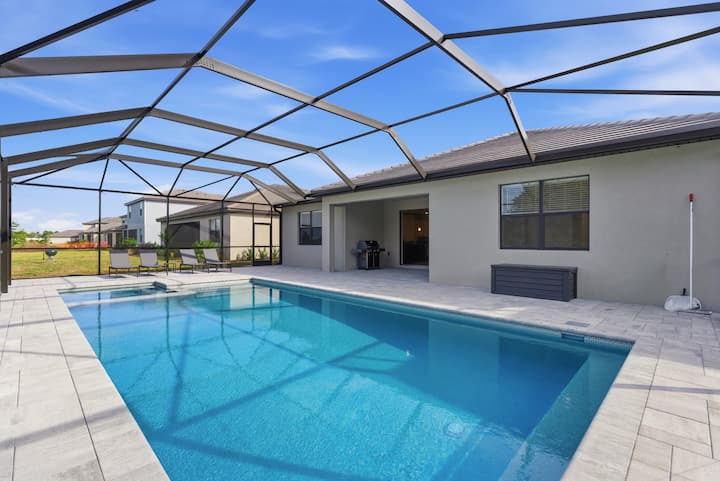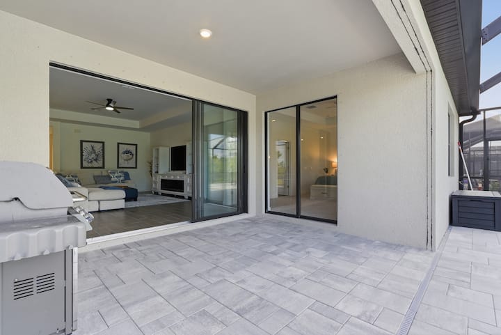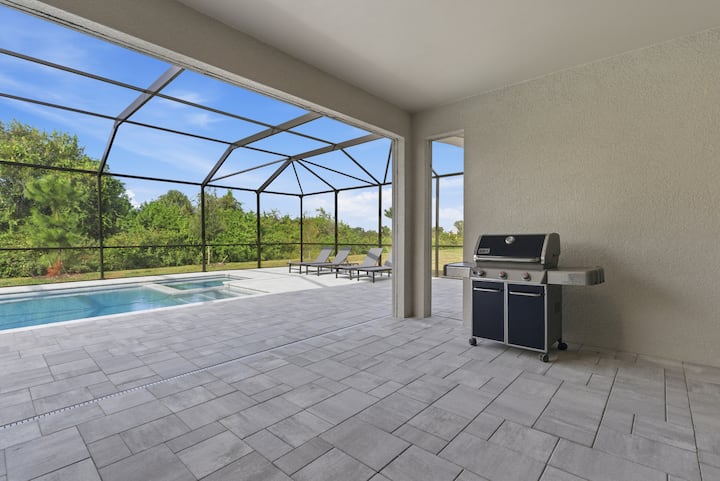 Sal a tu lanai protegido, donde puedes nadar, sumergirte y socializar con total privacidad. La impecable piscina climatizada y el jacuzzi integrado son suyos para disfrutarlos de día o de noche.El patio cubierto incluye muebles de salón y una parrilla Weber, ideal para barbacoas al atardecer.** Comodidades modernas **