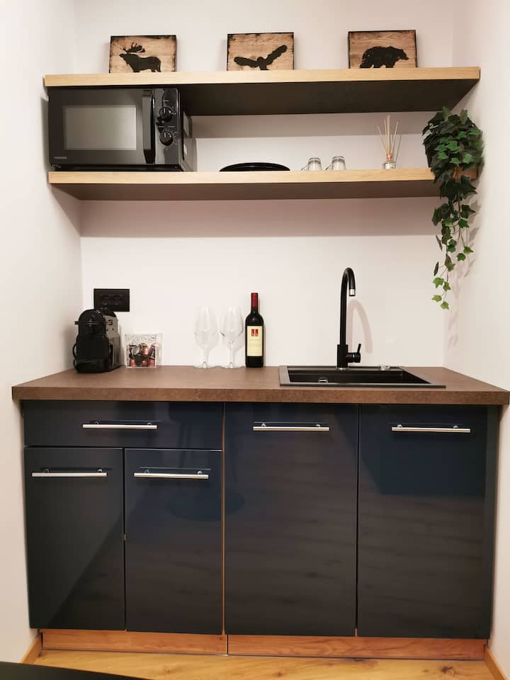 La cocina consta de un horno microondas, una máquina de café Nespresso (con cápsulas gratuitas), un hervidor de agua y un fregadero al servicio de la parte superior.