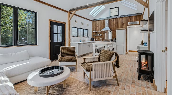 En el interior, encontrarás una planta abierta luminosa y espaciosa con techos abovedados y tragaluces que llenan el alojamiento con luz natural. La amplia sala de estar te invita a relajarte después de un día al aire libre, que se completa con una acogedora chimenea eléctrica para calentarte durante las frías noches de Vermont. La moderna cocina es el sueño de un chef, con una estufa y una campana de gas de acero inoxidable, muchas encimeras espaciosas para preparar comidas y todo lo que necesitas para comidas caseras. Coge un asiento en la isla de la cocina con cómodos taburetes de bar para cenar informalmente, desayunar o relajarse con una copa de vino. La comodidad es clave en toda la cabaña, con sistemas minisplit para calefacción y refrigeración personalizados en cada dormitorio y en la sala de estar principal, manteniéndote cómodo en invierno y fresco en verano. El dormitorio principal ofrece una cama tamaño queen, mientras que el segundo dormitorio, situado justo después de la cocina, tiene dos camas individuales. Ambos dormitorios están convenientemente adyacentes al baño compartido, que cuenta con una moderna ducha de pie.