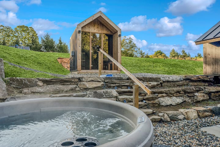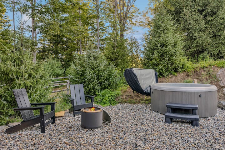 Sal y disfruta de tu propio oasis privado de montaña. En un conjunto de escalones de piedra encontrarás una impresionante cabaña de sauna al aire libre con puertas principales de vidrio, que ofrece calidez y relajación con vistas increíbles. Relájate en el jacuzzi privado o reúnete en el patio, que incluye asientos de comedor y cómodas sillas para descansar y comer al aire libre. Cerca del jacuzzi, las sillas Adirondack rodean una chimenea Solo Stove, perfecta para conversaciones nocturnas y contemplar las estrellas. Cada detalle del espacio al aire libre te invita a relajarte, conectarte y disfrutar de la belleza de Vermont.