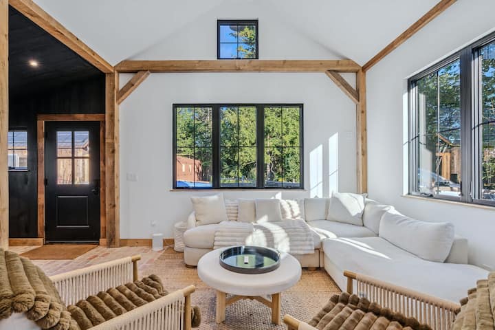 Experimenta el verdadero lujo con acceso a las pistas de esquí en la cima de Saskadena Six en Woodstock, Vermont, donde te espera una impresionante casa de campo llena de luz con techos altos, cocina de chef, jacuzzi privado y sauna de vidrio, a pocos pasos de las pistas. Relájate en una comodidad inigualable con un elegante diseño de montaña, espacios abovedados, una acogedora chimenea y un oasis al aire libre perfecto para la relajación de après-ski y escapadas a la montaña memorables.