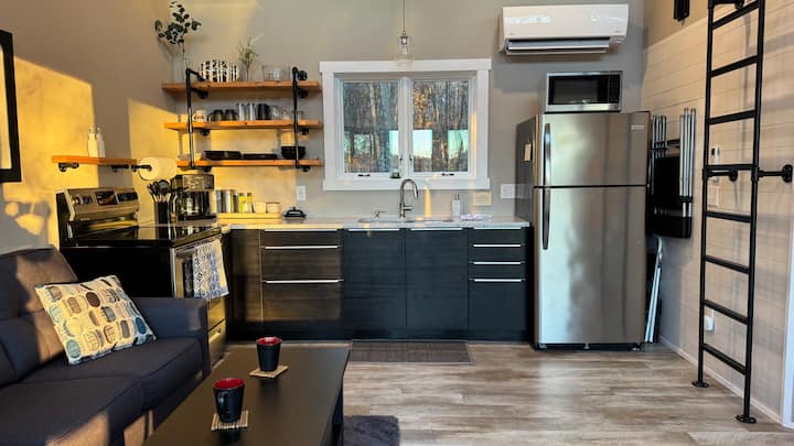 El dormitorio del nivel principal tiene una cama tamaño queen y ofrece espacio de almacenamiento y ganchos para ropa, artículos personales y toallas de baño. El loft tiene una cama queen y tiene vistas a la zona principal. El acceso a la escalera puede no ser adecuado para niños pequeños o huéspedes con movilidad reducida. El nivel principal incluye un medio baño con una ducha a ras de suelo sin bordes, toallas, champú sin sulfatos ni parabenos, acondicionador, gel de baño y artículos de tocador básicos.