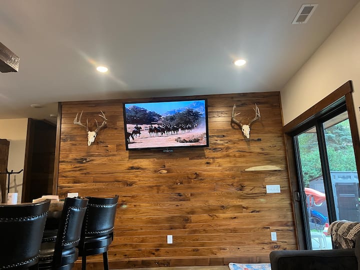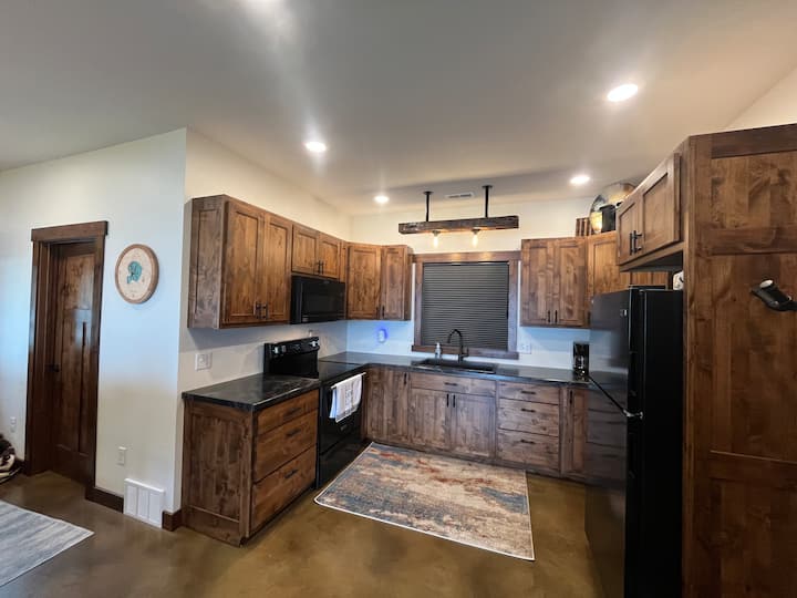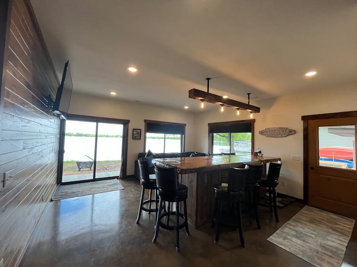 Esta nueva casa totalmente amueblada tiene todos los platos, ollas y sartenes, pequeños electrodomésticos, cafetera, tostadora, máquina de hielo, todo lo que necesitarás en tu hogar lejos de casa. Los extras para clima cálido incluyen asientos al aire libre, sillones, un muelle, kayaks, paddle board y parrilla de piedra negra.