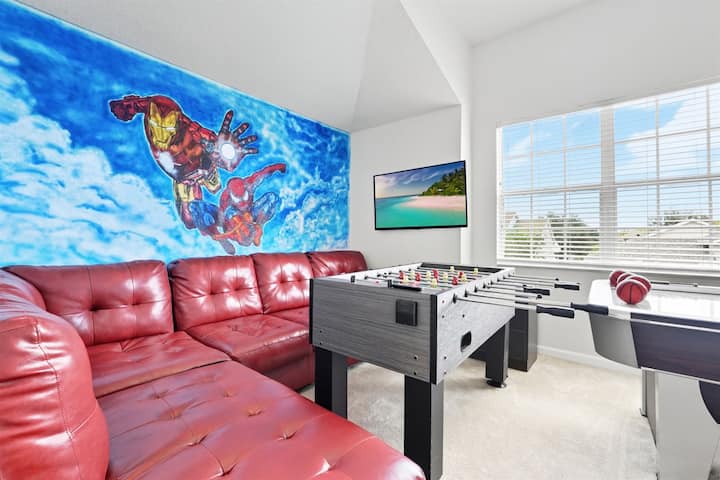 ¡Descubre esta mágica casa de 4 dormitorios y 4 baños con temática de Disney en Kissimmee, FL! 🏰 A solo minutos de las atracciones de Walt Disney World y Orlando, disfruta de tu propia piscina privada, relajante jacuzzi y una divertida sala de juegos con futbolín y hockey de aire. Lo suficientemente amplio para familias y grupos, además de estacionamiento para un máximo de 4 autos. Perfecto para acceder fácilmente a parques temáticos, tiendas y restaurantes. ¡Tus vacaciones en Orlando comienzan aquí! ✨🎢🎉🌴