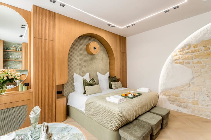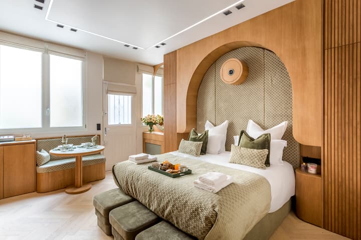 Impresionante estudio con aire acondicionado, totalmente renovado por un arquitecto, idealmente ubicado en el corazón del prestigioso distrito de Marais, a pocos minutos del metro. Este refugio combina elegancia y comodidad: una cama tamaño king de alta gama (180×200) con un colchón grueso de primera calidad, una moderna cocina totalmente equipada, ducha italiana con banco, amplio espacio de almacenamiento, comedor y cine en casa. Tranquila, luminosa y refinada, a pocos pasos de la Place des Vosges, museos, cafés y boutiques elegantes.