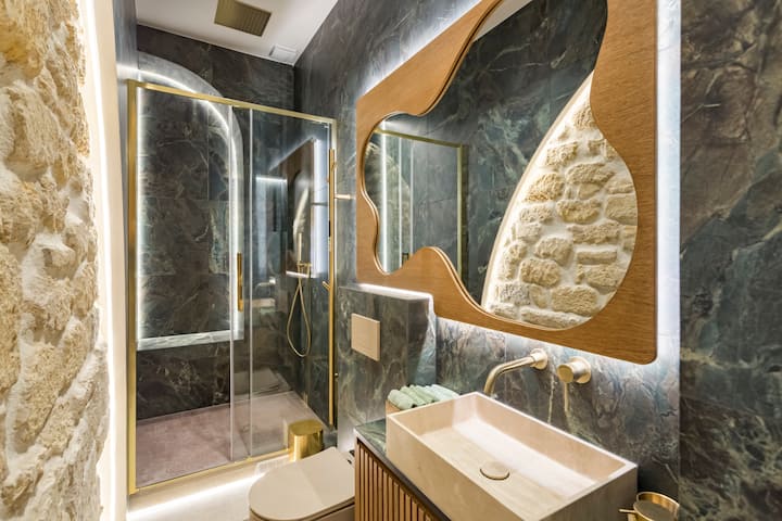 La ducha de estilo italiano, con su banco incorporado, añade un toque de elegancia y comodidad modernas para una estancia relajante.