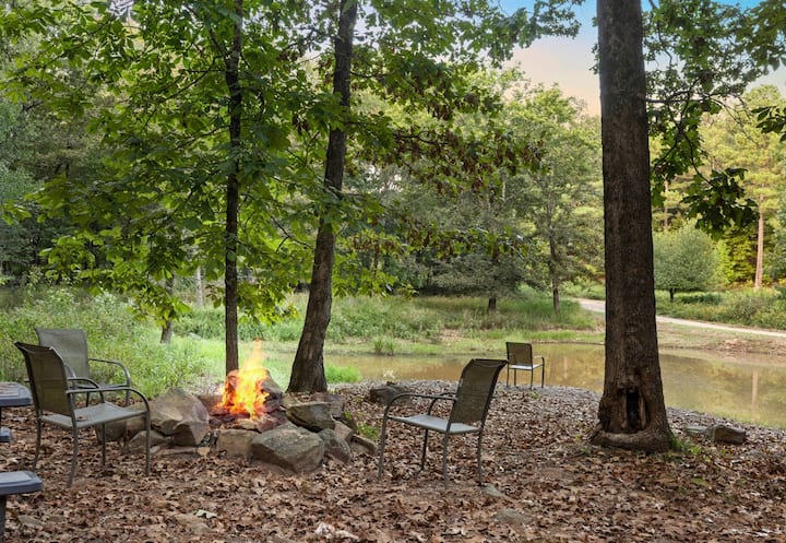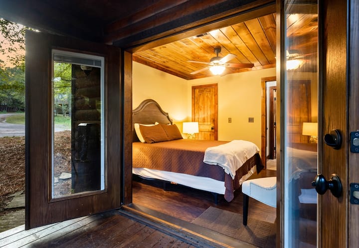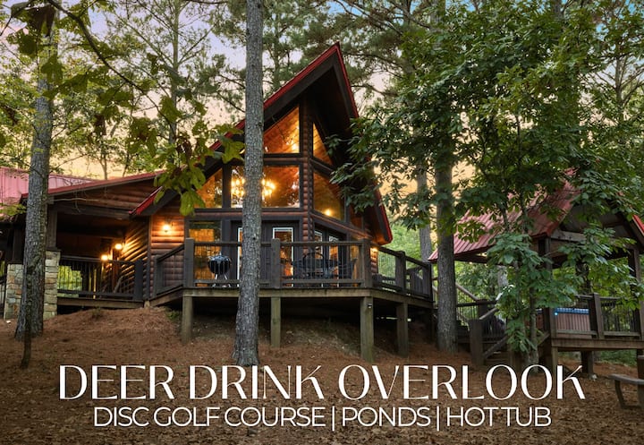 Deer Drink Overlook es una acogedora cabaña de dos dormitorios ubicada dentro de un refugio privado de 40 acres, que ofrece una vista de primera fila de un tranquilo abrevadero donde los ciervos a menudo pasan. Rodeada de árboles imponentes y los sonidos tranquilos de la naturaleza, esta cabaña combina el encanto rústico con las comodidades modernas. Como una de las ocho cabañas de la propiedad, es una opción maravillosa para parejas, familias o grupos pequeños que desean sentirse escondidos mientras disfrutan del acceso a servicios compartidos en todo el refugio, incluidos cuatro estanques de pesca de captura y liberación, senderos panorámicos para caminar y andar en bicicleta, un campo de golf de nueve hoyos y un pozo de herradura.