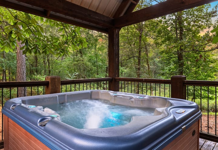 En el interior, la cabaña es cálida y acogedora con detalles de madera, una sala de estar centrada alrededor de una chimenea de leña y una cocina totalmente equipada lista para comidas caseras. Ambas habitaciones están diseñadas para la relajación, con el piso de arriba que ofrece un balcón privado para mañanas tranquilas con vistas. En el exterior, puedes sumergirte en el jacuzzi, asar malvaviscos alrededor del fogón o disfrutar de una comida informal en la parrilla de carbón de la terraza. Ya sea que estés viendo ciervos pasear o simplemente disfrutando de las vistas del bosque, es un espacio hecho para relajarte y reconectarte.