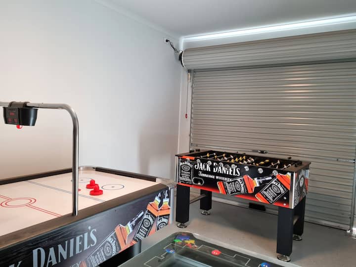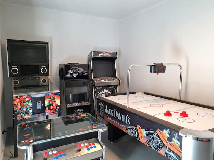 Sala de juegos con una variedad de juegos que incluyen juego de arcade de mesa Pac-man, pinball de Marvel, juegos para 2 jugadores, mesa de futbolín y mesa de hockey de aire