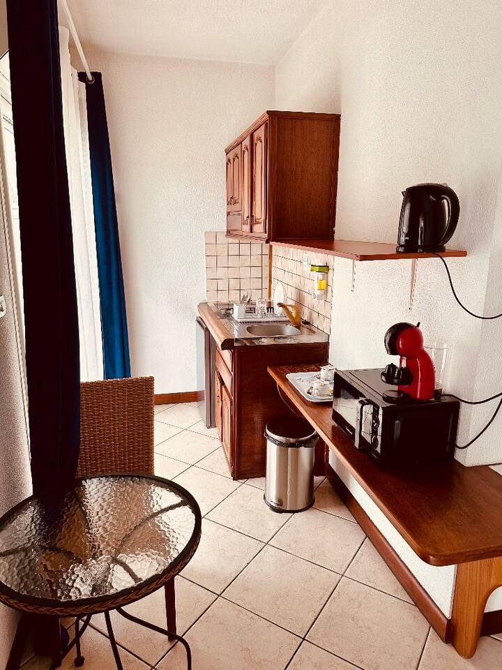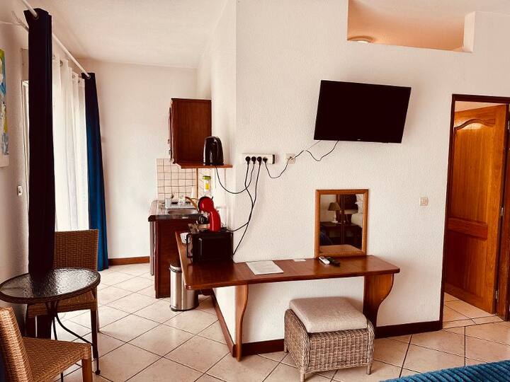 Estudio con cocina americana y baño privado.