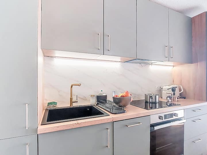 Apartamento de 2 habitaciones de 42 m2 en el séptimo piso, orientado al sur. Parcialmente renovado en 2025, cómodo y moderno mobiliario: salón comedor con 1 sofá cama doble (1 x 140 cm, longitud 190 cm), mesa de comedor y TV. Sal al balcón, orientación sur. Hall de entrada con rincón de cocina.